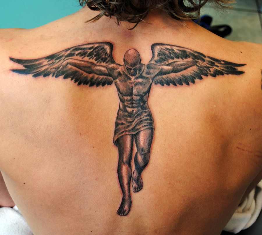 Самые эффектные – мужские тату ангела на спине. Именно здесь обычно изображают эпичные баталии или ангелов с расправленными крыльями. Смотрится великолепно.
