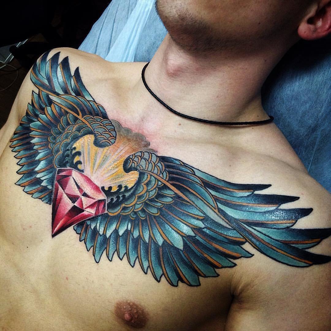 Рисунок птицы на груди говорит о том, что его обладательница имеет собственное мнение по любому жизненному вопросу и не желает слепо подчиняться общепринятым нормам. Такая татуировка – некий вызов окружающему миру.