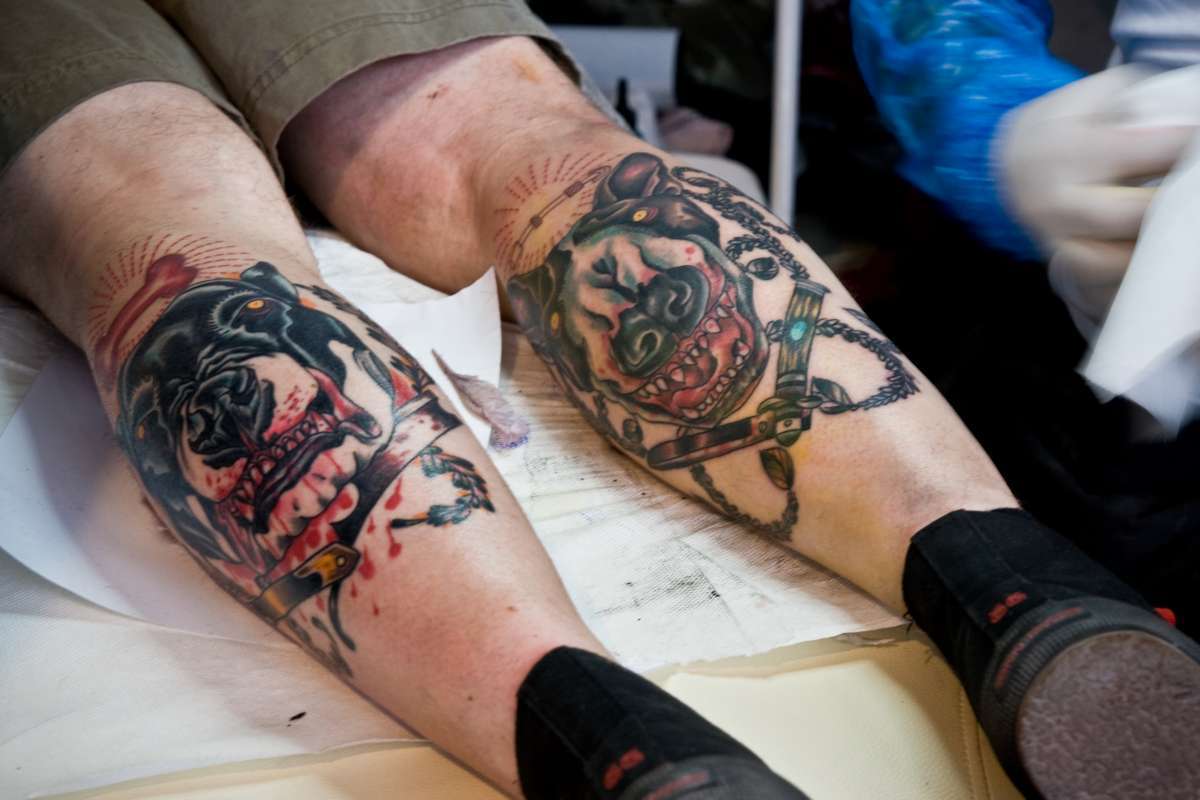 Выбирая место для татуировки на ноге, мужчины долго не выбирают, останавливая свой выбор на икрах. Икры – популярное место для нанесения картинок, которое используется не так давно. Такие тату можно наносить как на одну из ног, так и на обе одновременно. При создании парного рисунка используется единый сюжет, который делится на две ветви. Вы также можете использовать разные татуировки, выполненные в одном стиле. Так как эта часть тела не особо чувствительна к боли, можно использовать большой заполненный узор на всю голень.