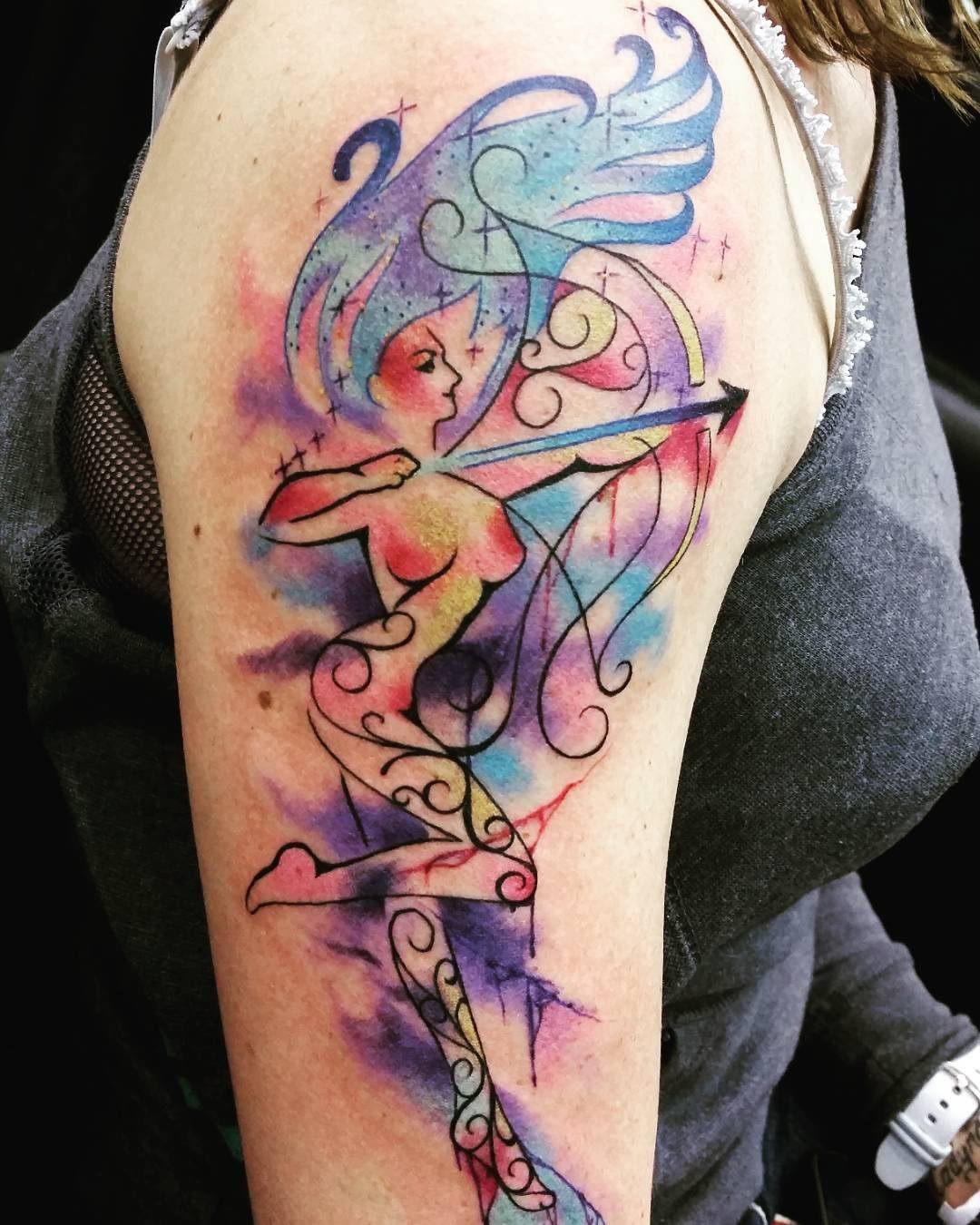 Татуировки с кентавром лучше выполнять в естественных оттенках: черном, коричневом, телесном. Такое решение поможет усилить влияние тату на жизнь человека, придаст ему мужества и силы. Нередко татуировку украшают огненными оттенками: оранжевым, желтым, красным. Стрельцы относятся к стихии Огня, поэтому использование этих оттенков вполне допустимо.