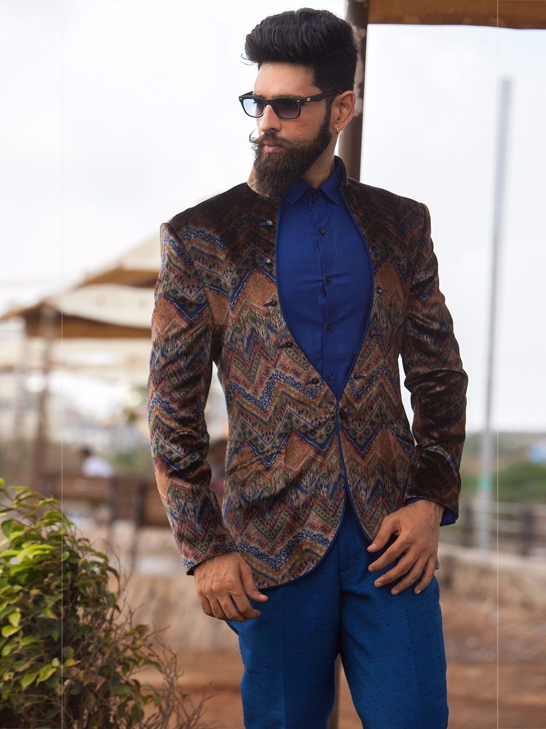 Шоколадные брюки классического фасона хорошо «соседствуют» с тёмным пиджаком и синей рубашкой. Последняя, к слову, делает яркий акцент в образе. В обуви не возбраняется спортивный жанр.