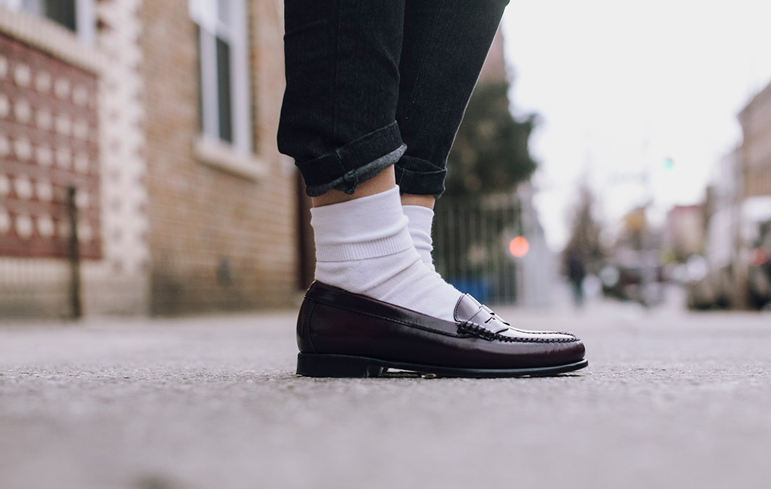 Удивительно, но существует целый «клан» любителей сочетать белые носки с чёрными лоферами! Лоферы могут быть кожаными или замшевыми, не всегда чёрными, хотя этот цвет в приоритете, и часто «образ» дополняется джинсами.