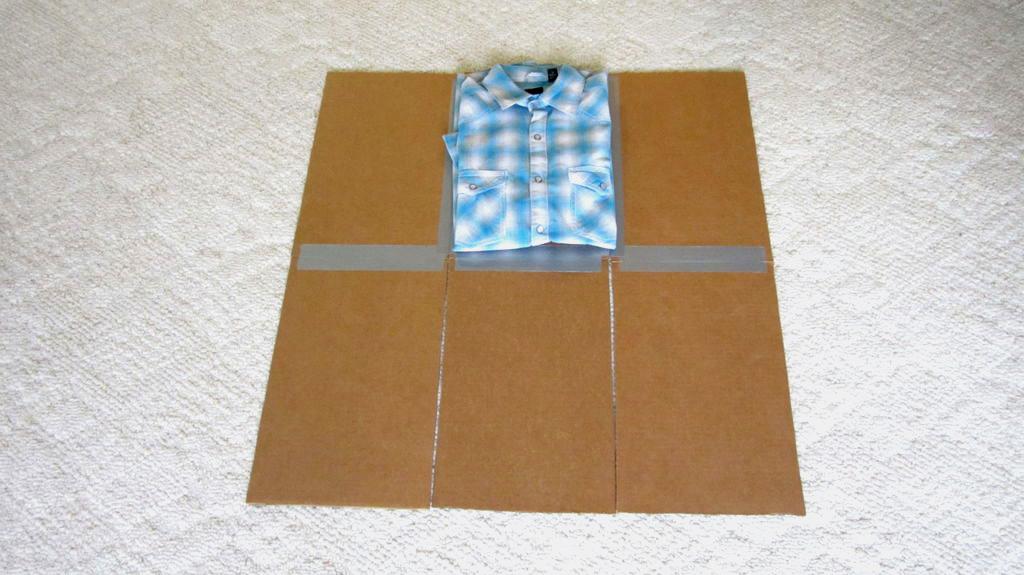 Чтобы упаковать сорочку, понадобится плотный картон прямоугольной формы. Если спинку разделить на 3 части, то по ширине он должен занимать весь центр, высота — 1/3 длины изделия. Затем картон сложить на 2 части, чтобы по центру остался изгиб. Это облегчит процесс складывания вещи. Технология упаковывания состоит из следующих шагов: