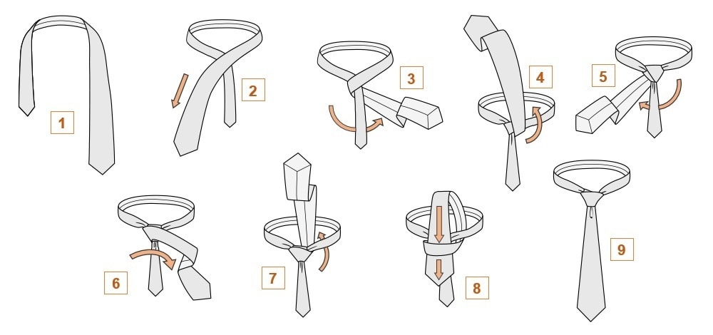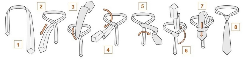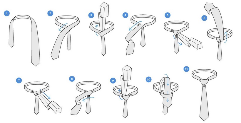 Для еще большей наглядности мы предлагаем вам фото и схему узла “Виндрзор”, где наглядно изображен весь процесс того, как правильно завязывать галстук.