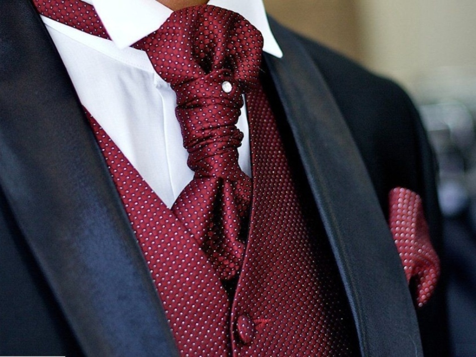 Бордовый галстук аскот с костюмом и белой рубашкой