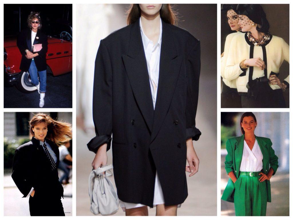 - Жакеты и пальто с расширенной линией плеч. Они не настолько широкие, как в 80-х, но вполне подойдут для создания необходимого стиля.