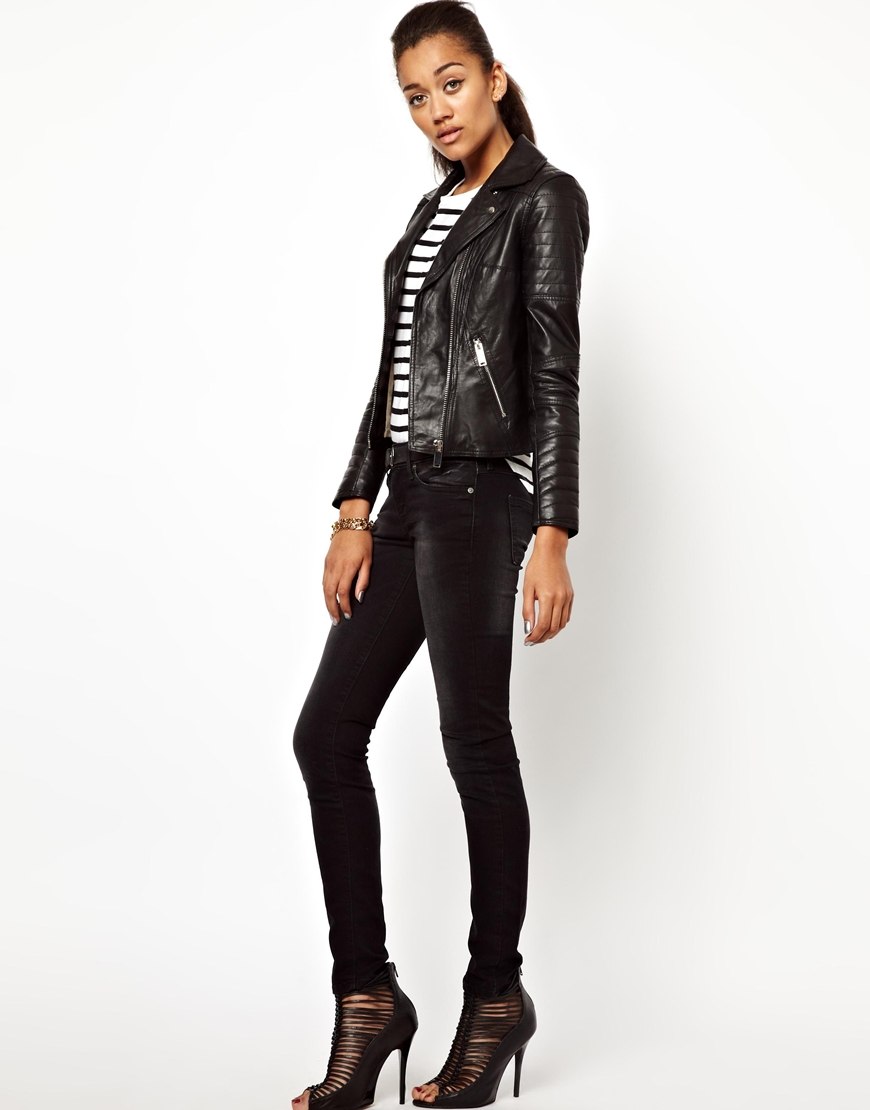 Если хочешь надеть куртку с черными джинсами, то надевай под нее контрастный топ. Например, это может быть тельняшка, джемпер с анималистичным принтом, блуза в горох и так далее.