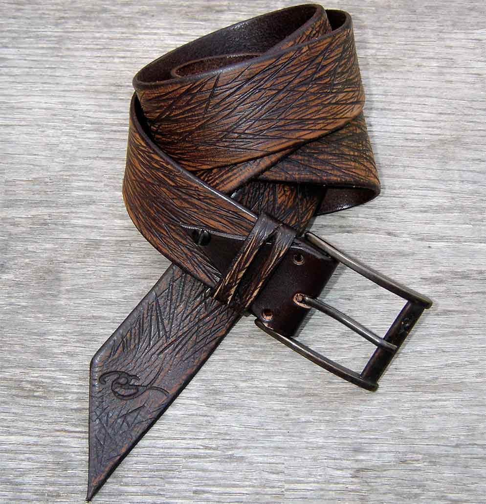 Раритетная модель для любителей аксессуаров в духе «старого доброго Дикого Запада». Изготовлен из цельного куска натуральной кожи, без подложки. На коже выжжены оригинальные узоры. Все модели линейки выполнены вручную. Ремень широкий и выглядит массивно, но стильно. Пряжка сделала из железа и несколько раз протравлена кислотой для получения на поверхности металла природного орнамента.