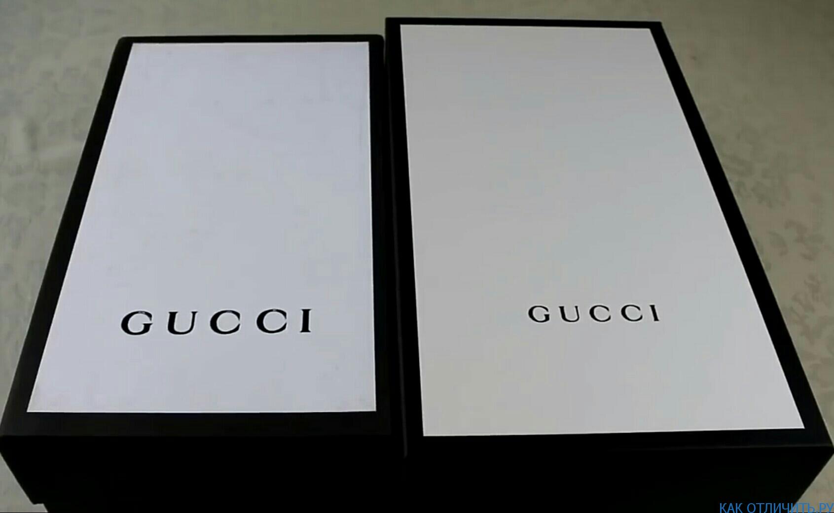 Надпись Gucci на крышке поддельной коробки значительно крупнее, а шрифт жирнее.