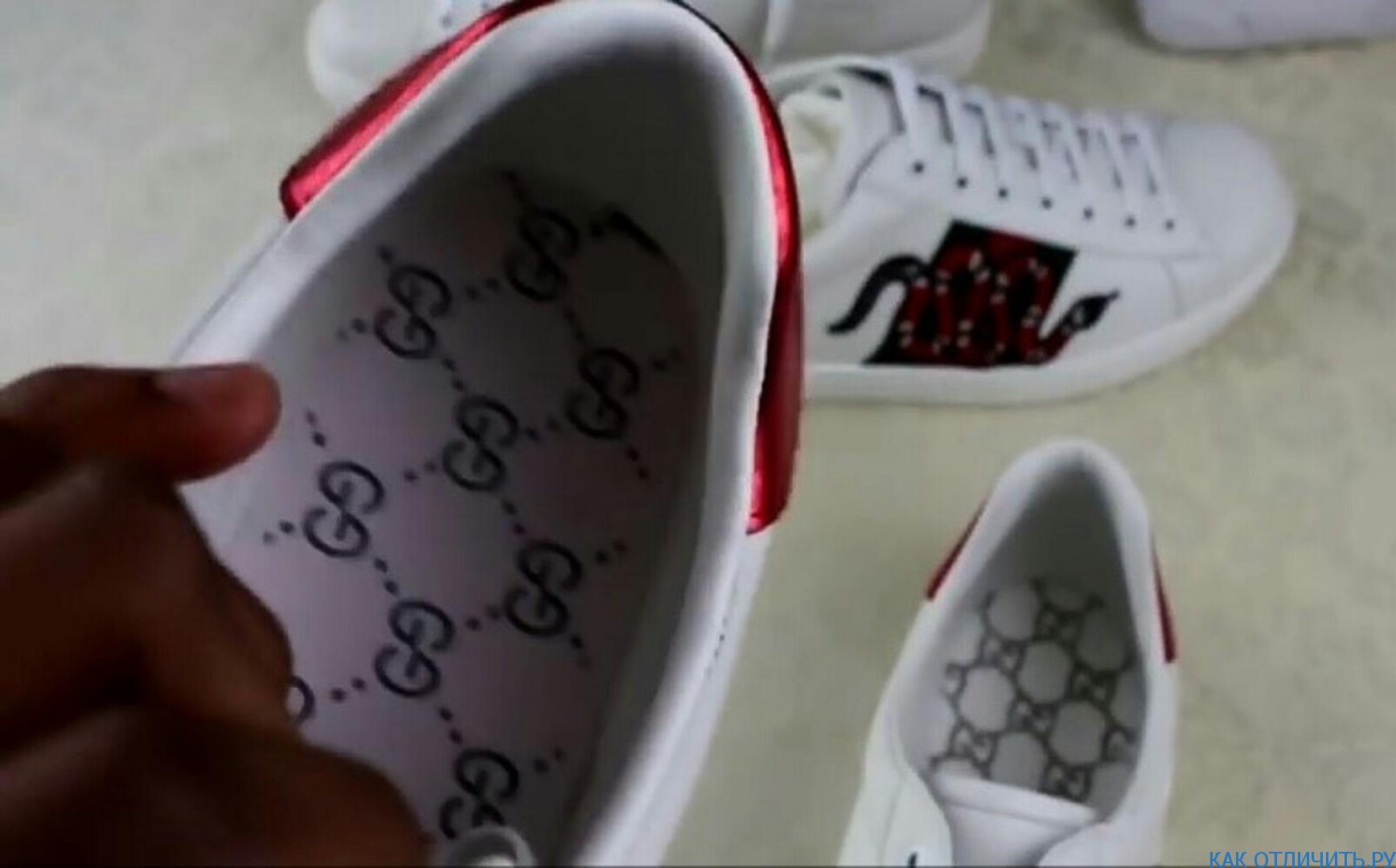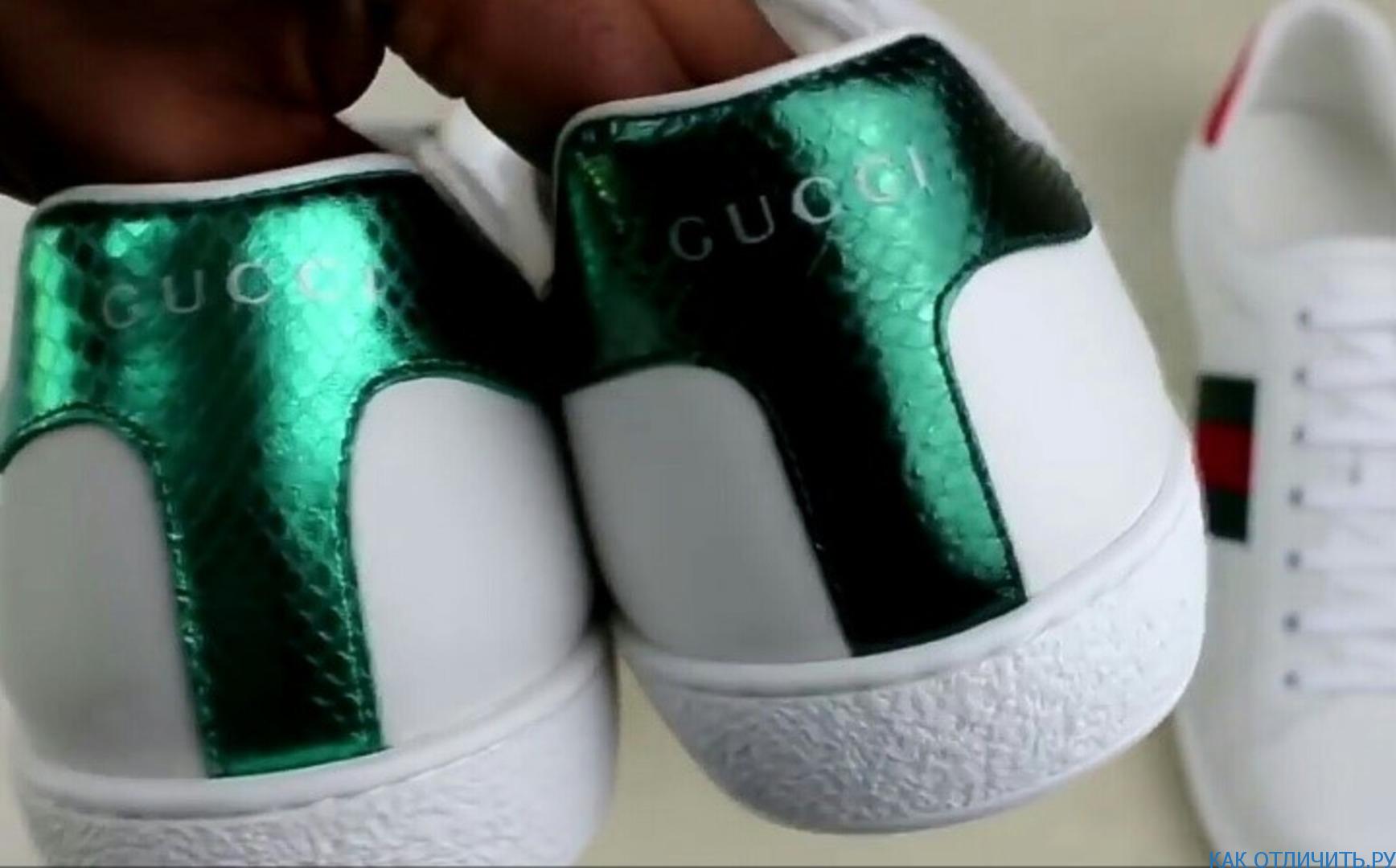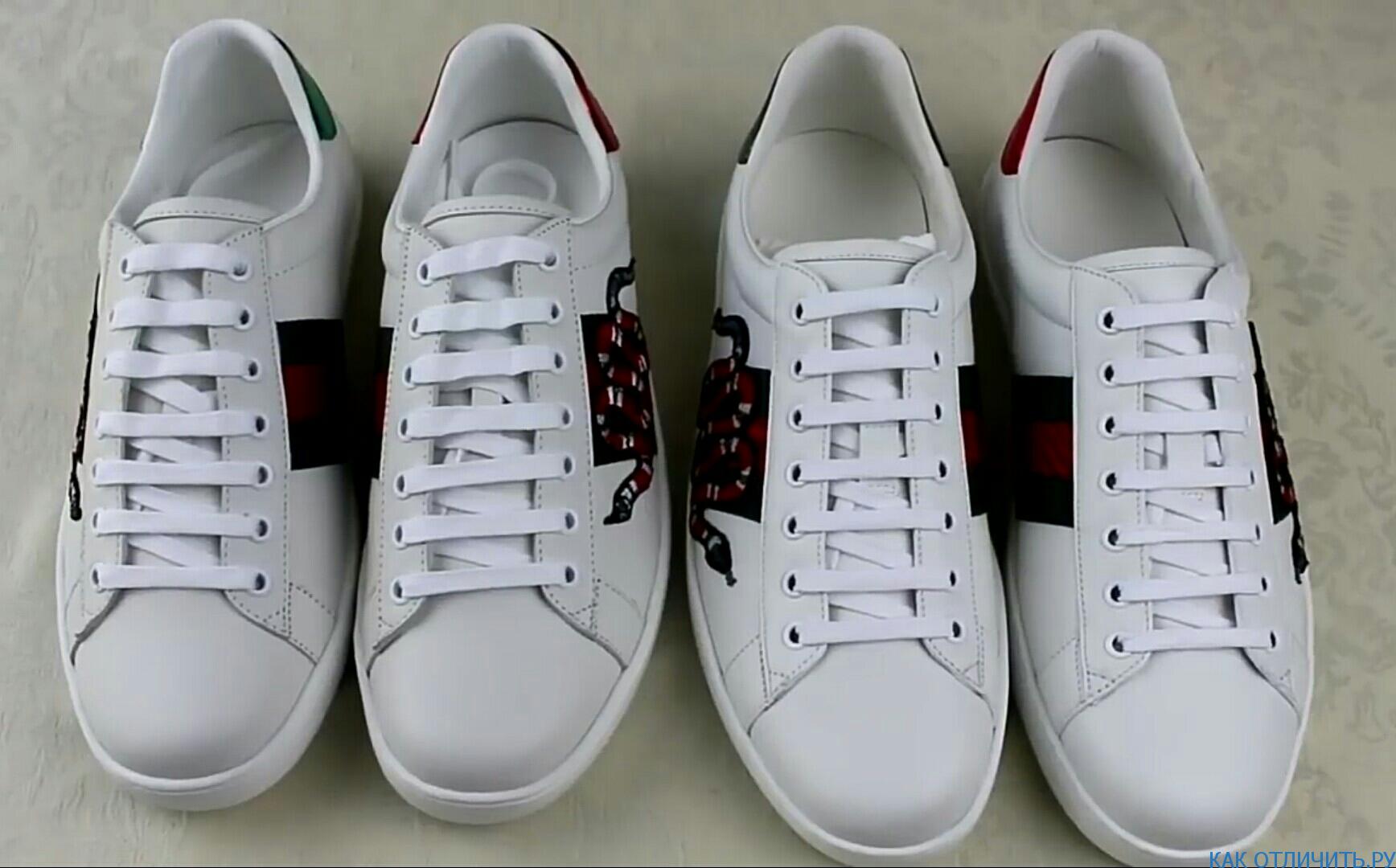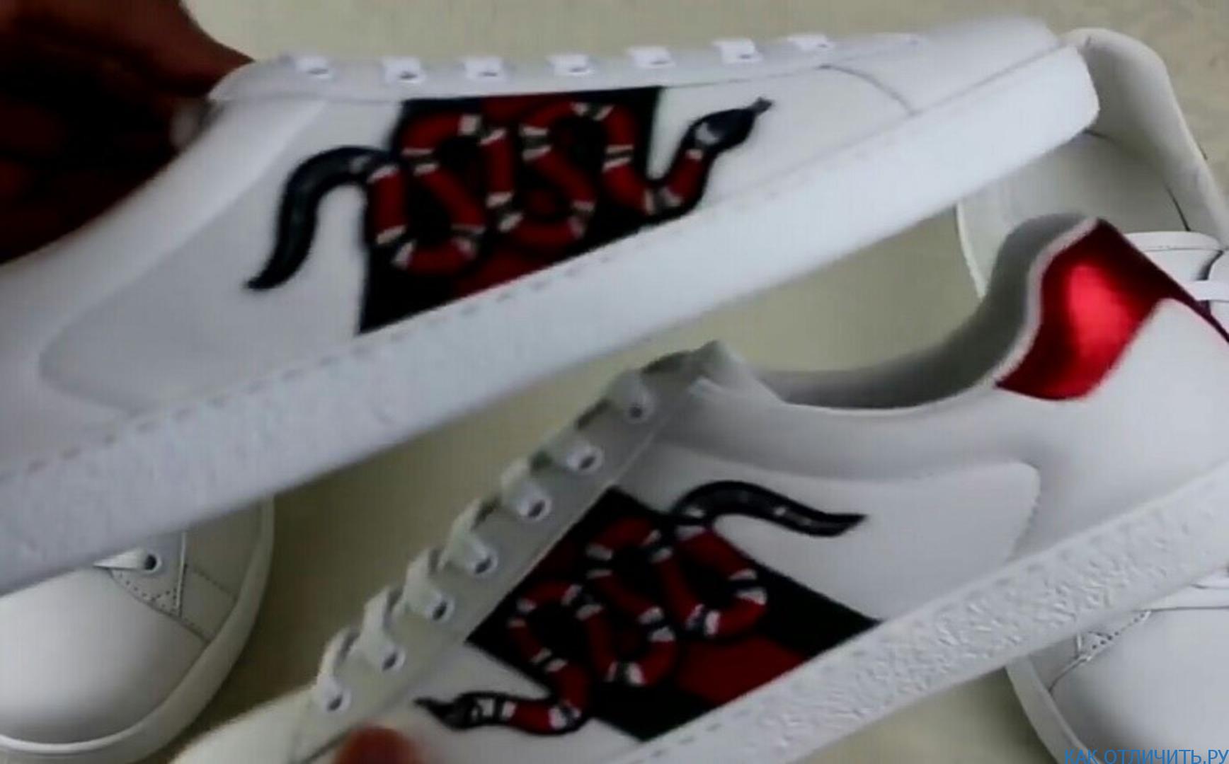 Главное отличие оригинальных и поддельных кроссовок Gucci Ace Snake Sneakers – в способе выполнения змейки. Язычок оригинальной змеи маленький, его не пришили к самому кроссовку. Поддельная змея имеет крупный язык, обшитый черной нитью. Качество исполнения самой змеи тоже не самое лучшее.