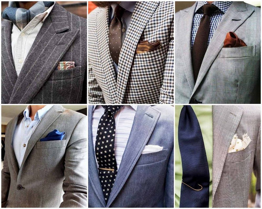 С дорогим костюмом плохо сочетаются случайные аксессуары, купленные впопыхах в первом попавшемся магазине. Важен материал, расцветка, аккуратная обработка краев. Шелк, бархат, габардин, полиэстер, лен, замша, атлас, хлопок — любой из этих вариантов возможен, главное чтобы он сочетался, но не повторял ткань пиджака. Стоит помнить еще о галстуке, платок-паше лучше с ним сочетается, если по фактуре они отличаются — к блестящему галстуку матовый платок и наоборот.