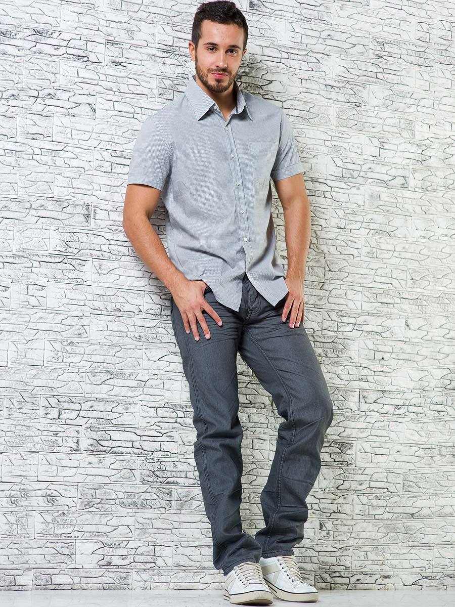 Светлая рубашка с короткими рукавами и серые джинсы можно надеть на работу или на прогулку с друзьями. Если вы придете на свидание к девушке в таком луке, она обязательно это оценит.