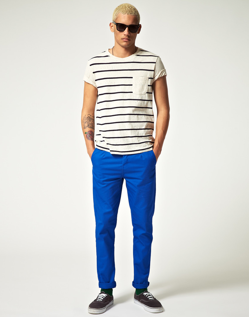 - Очень яркий и насыщенный тон мужских брюк лучше всего дополнить одеждой, обувью и аксессуарами приглушенных, нейтральных цветов. В таком случае можно носить яркие синие штаны и с желтыми, красными, розовыми или фиолетовыми мужскими рубашками, но подобное сочетание будет очень смелым и оригинальным;