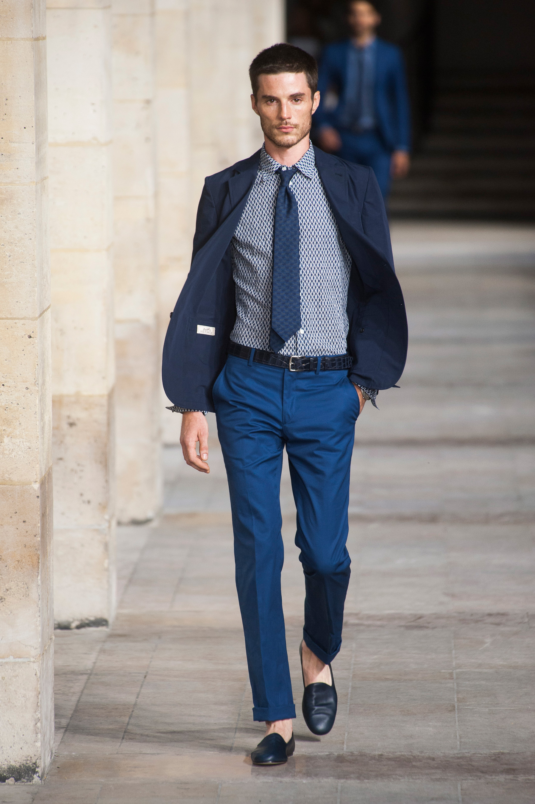 Особенно удачно с небесным оттенком в мужском луке сочетаются белый, коричневый, рыжий, серый и черный колеры. Несмотря на то что речь идет о мужском образе, вполне уместно предположить наличие геометрического принта. Очень эффектно смотрится клетчатый принт. Дизайнеры предлагают ориентироваться на практичную двухцветную клетку в комбинациях с белым или черным. Носить клетчатые прямые или зауженные брюки лучше с однотонным пиджаком, светлыми сорочками, кардиганами и джемперами. Самым удачным дополнением к насыщенным синим брюкам является однобортный пиджак.