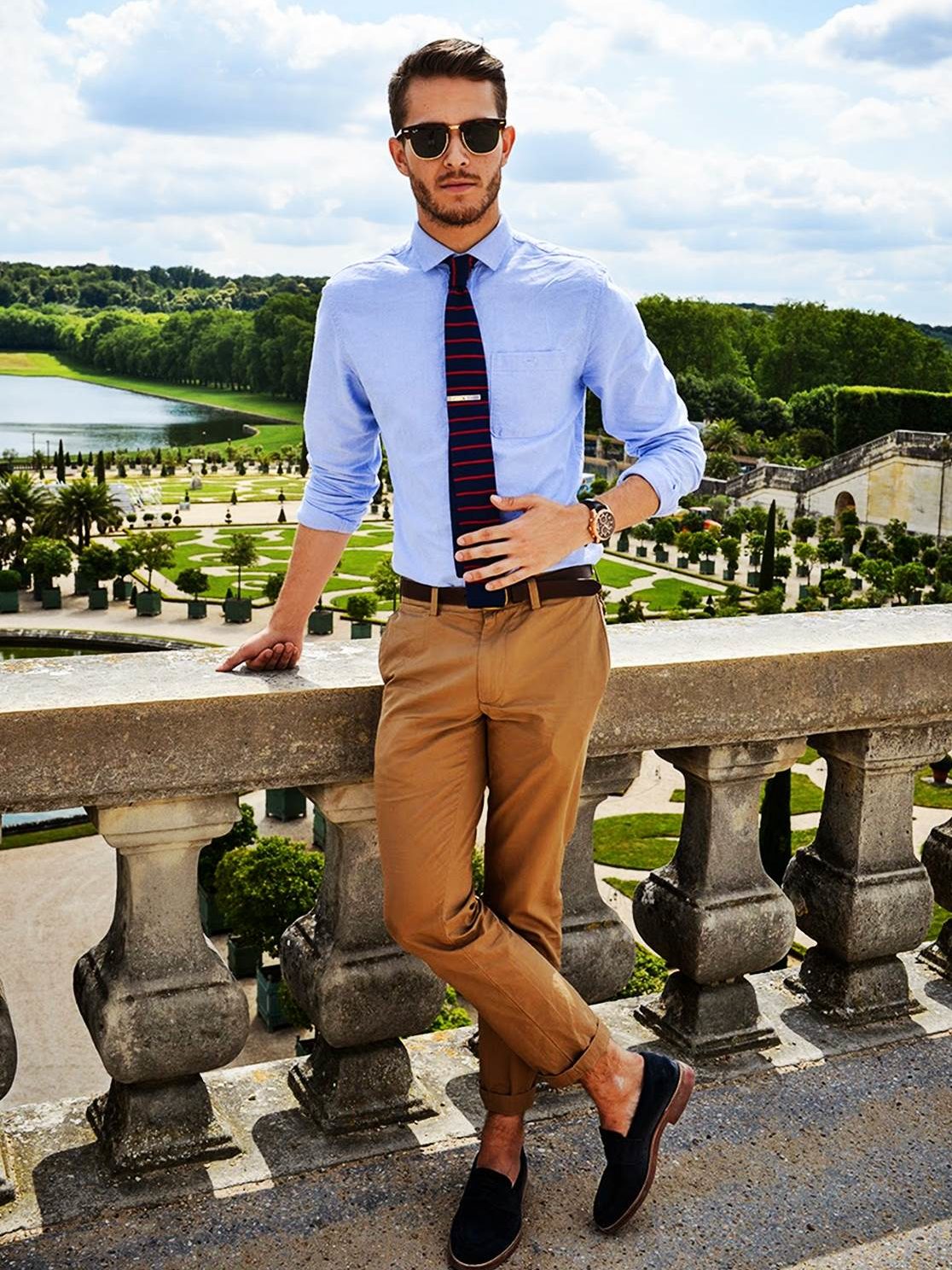Коричневый подходит и для классического образа, и для повседневного. Классика — верх синего, белого или серого цвета. С песочными чинос прекрасно будет смотреться красный, розовый, бордовый верх, коричневые обувь и аксессуары.
